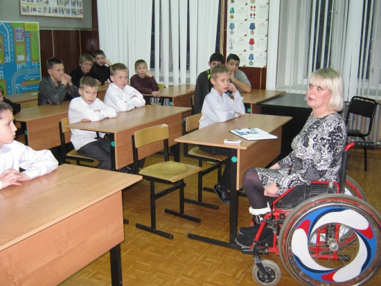 Специалист ОСЗС Светлана Канева провела урок в игровой форме. В самом начале она попросила каждого ученика представиться и назвать профессию, о которой он мечтает, затем провела игру в ассоциации. Ребята с большим энтузиазмом говорили, что учитель, например, ассоциируется у них с уроком, доской и мелом; чиновник — с человеком в костюме, властью и Путиным; Алла Пугачева — с песней, голосом, знаменитостью; а инвалид — с жалостью, любопытством и помощью. Именно эти ассоциации послужили поводом для дальнейшего разговора об отношении к инвалидам в российском обществе, о той помощи, которую каждый из нас в силах им предложить.