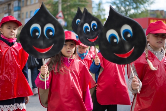Четвертого сентября красочная колонна, возглавляемая стройными барабанщицами, за которыми следовали, флагоносцы, юные танцоры с разноцветными шарами и главные герои действа Нефтяничек и Газовичок в сопровождении раритетной техники прошли по проспекту Ленина до Комсомольской площади, где их встречали первые лица города.