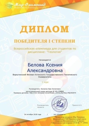 Студенты первого курса Воркутинского филиала УГТУ Юлия Гималетдинова и Ксения Белова приняли участие во Всероссийской дистанционной олимпиаде по химии и геологии, организованной Всероссийским СМИ «Образовательный портал «Академия Интеллектуального Развития». Обе девушки получили дипломы победителей I степени. Благодарственными письмами за подготовку победителей награждены и их преподаватели – доцент кафедры разработки и эксплуатации месторождений полезных ископаемых А. Б. Билалов и доцент кафедры строительства и экономики Н. И. Ратиер.