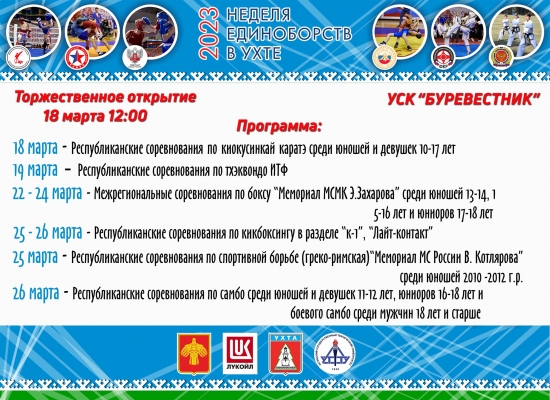 18 марта на базе спорткомплекса УГТУ "Буревестник" стартует спортивный проект - «Неделя единоборств – 2023». Организаторами состязаний выступают Министерство физкультуры и спорта Республики Коми, администрация МОГО "Ухта", ООО "Лукойл-Ухтанефтепереработка" и Ухтинский государственный технический университет. Город ожидает принять более 500 спортсменов из разных городов России.