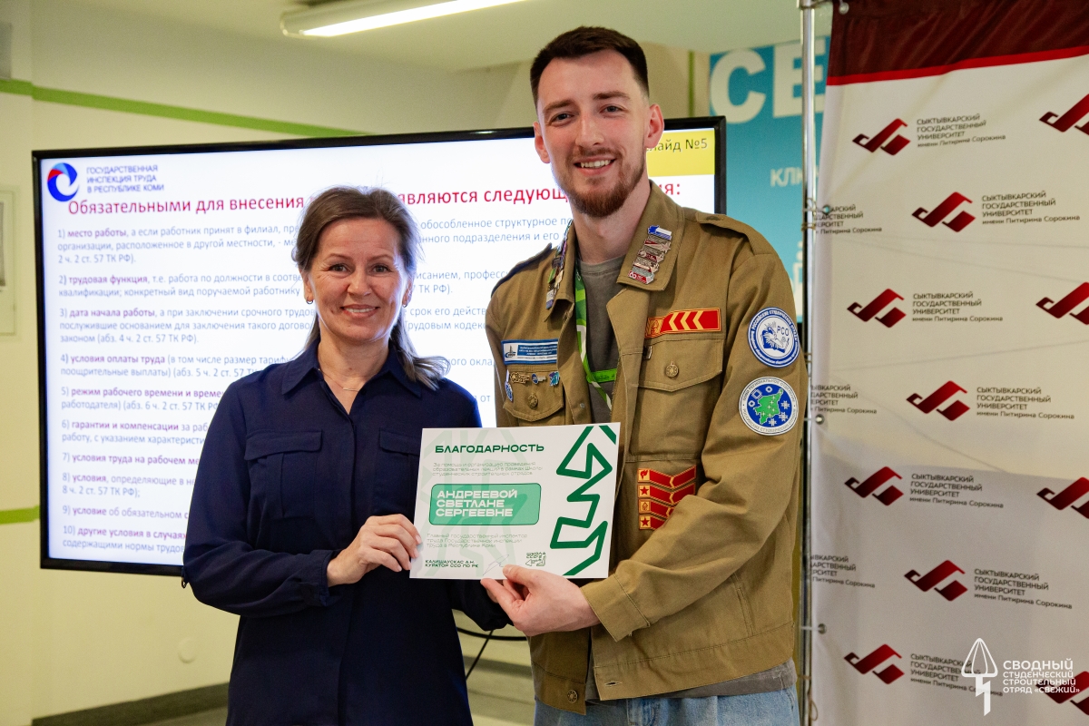 - «В этом году нас ожидают трудовые проекты „Газпрома“ с должностями разнорабочих, техников ПТО, дорожных рабочих, геодезистов, инженеров по сварке. Ребята отправятся на „Алабуга Строй“ в должностях разнорабочих, а также на местные объекты Республики Коми».